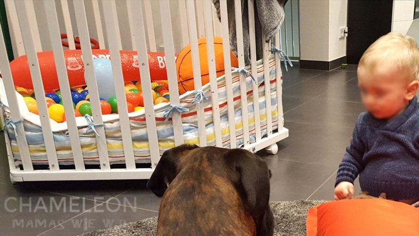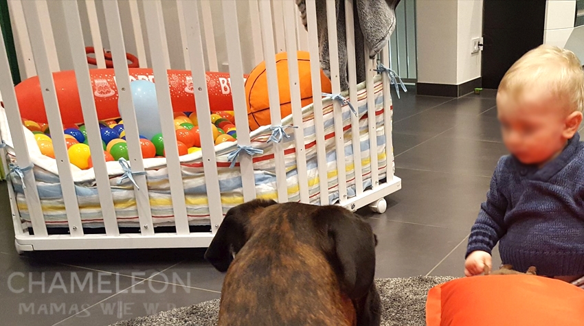 Ich dachte mir erst, es wäre doch eine gute Idee, den Laufstall mit den 500 Bällen etwas interessanter zu gestalten, was aber leider ein absoluter Reinfall war! Denn in den Laufstall will der kleine Mann überhaupt nicht mehr! Das grenzt ja an Freiheitsberaubung; wenn man mal die Fortbewegung für sich entdeckt hat, ist das nicht mehr drin Mama! Also musste eine Alternative her. Da kam mir die große Kiste von dem bestellten Sitzsack gerade recht!
