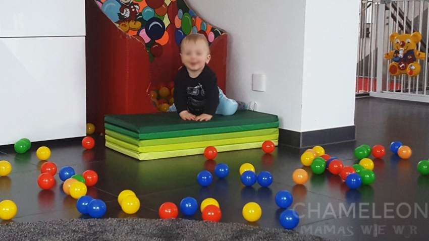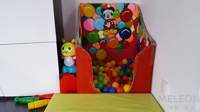 Mit einem Messer und Acrylfarbe bewaffnet habe ich versucht den Karton so interessant wie möglich zu gestalten, was mir letztendlich dann auch gelungen ist. Ben liebt sein Bällebad heiß und innig. Als Einstieg habe ich die Matte von Ikea davor gelegt, was auch für etwas Tiefe in der Kiste sorgen sollte, das nicht alle Bälle gleich wieder herausrollen! Das funktioniert auch ungefähr so lange, bis das Kind in den Bällen taucht und strampelt, herum tobt und die Bälle in der Wohnung verteilt wie ein kleiner Tornado.