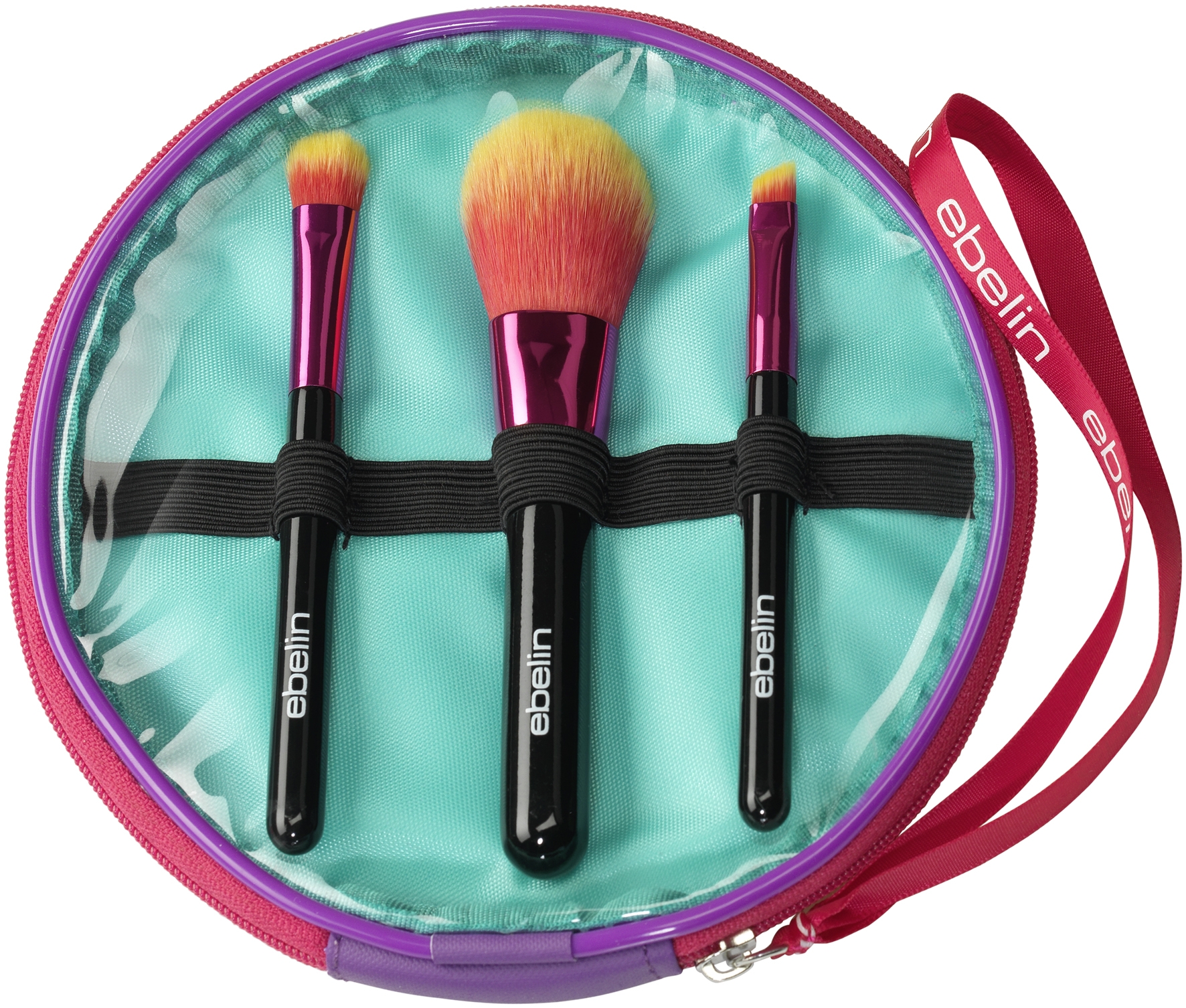 Farbenfrohe Kosmetiktasche mit 3-teiligem Pinselset in knalligen Farben. Das Pinselset besteht aus einem Puderpinsel, einem Lidschattenpinsel und einem Eyelinerpinsel. Die Kosmetiktasche schützt die Pinsel unterwegs und auf Reisen; eignet sich zudem aber auch perfekt als Aufbewahrungsmittel für andere Kosmetikschätze.